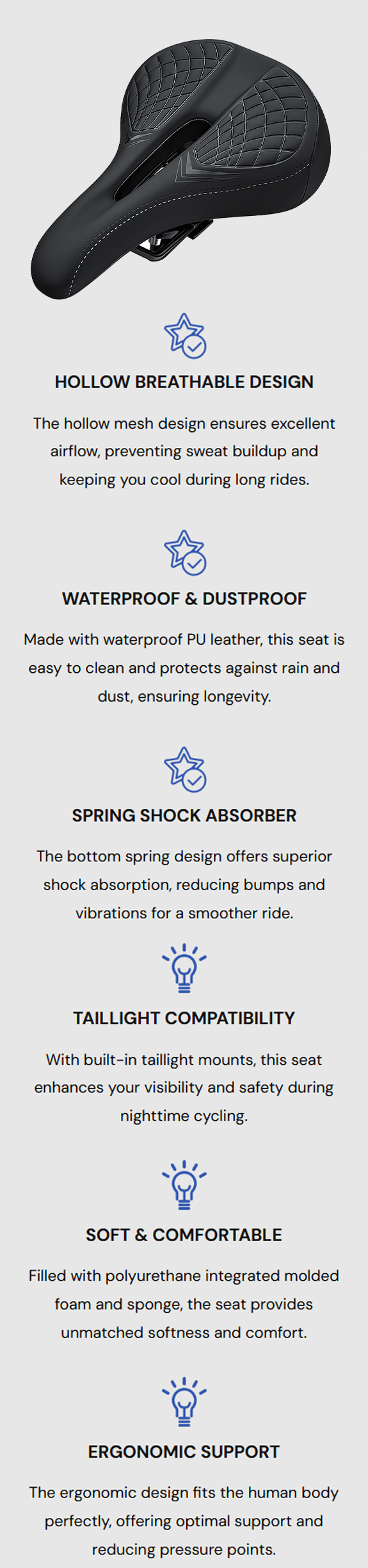 - Soft Comfortable Padding - PU foam and sponge absorb shocks for a smoother ride.