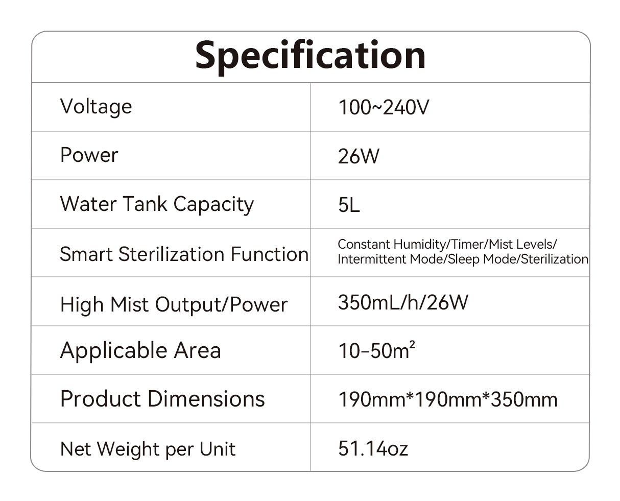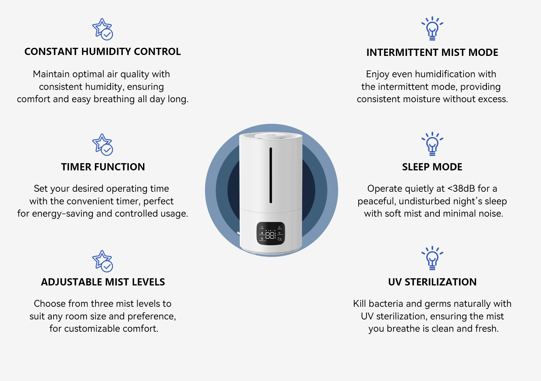 - Smart Humidity Control - Adjustable from 40% to 95% for personalized comfort.